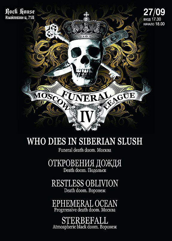 27 сентября в московском клубе Rock House в первый и единственный в истории раз творческим объединением MOSCOW FUNERAL LEAGUE будет представлена захватывающая funeral/ death doom драма в пяти актах!